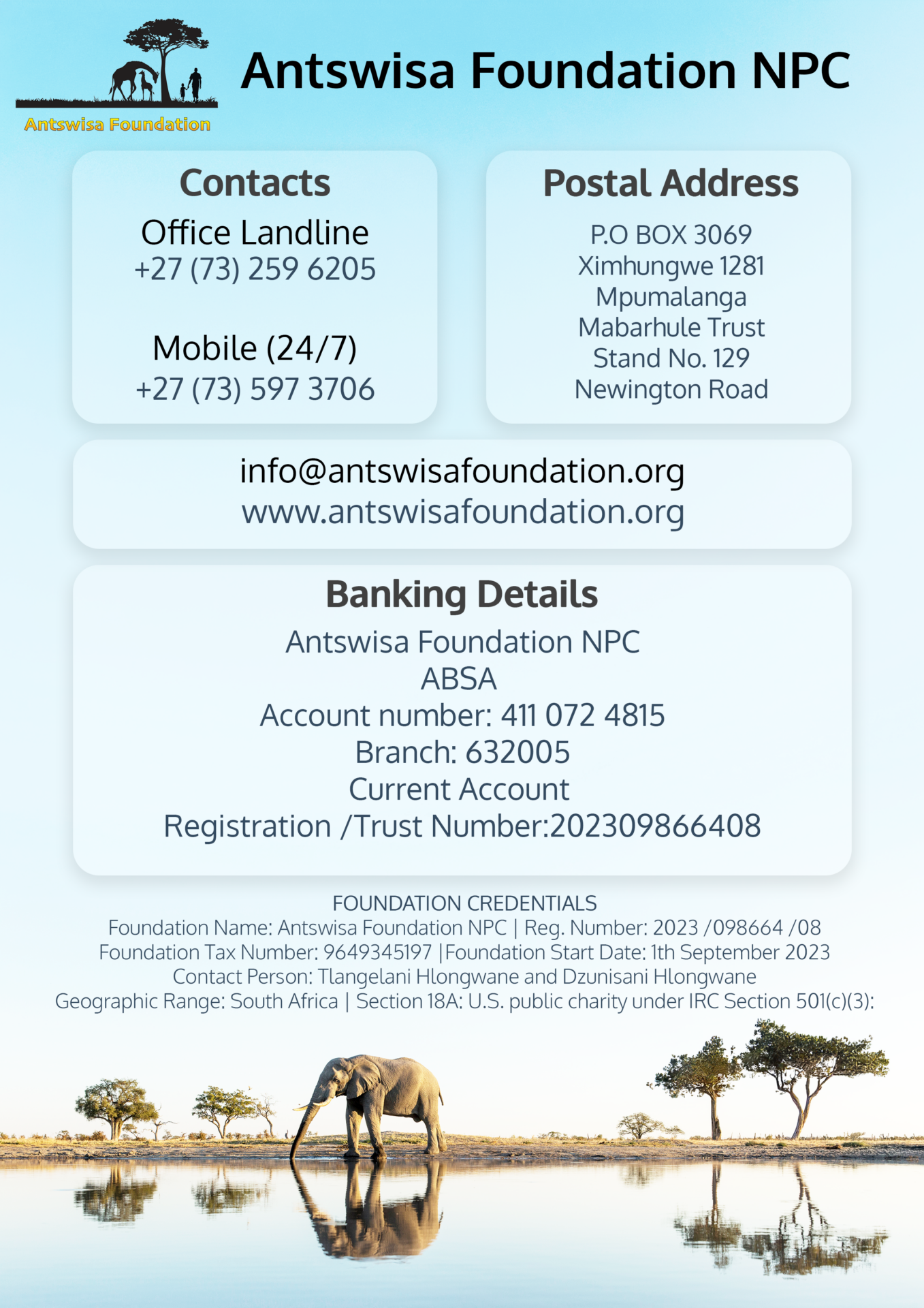 Antswisa Foundation is a registered non-profit organisation based in the Mpumalanga Lowveld,in villages bordering the world-renowned Kruger National Park and Sabi Sand Nature Reserve.